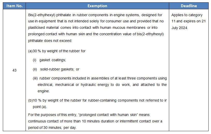 On 5 November 2019, the Official Journal of the European Union has published Commission Delegated Directives (EU) 2019/1845 and (EU) 2019/1846 to amend exemptions in Annex Ⅲ, these exemption extension concern the use of DEHP in certain rubber components used in engine systems, and the use of lead in solders used in certain combustion engines. These Directives will enter into force on the twentieth day following that of its publication in the Official Journal of the European Union.