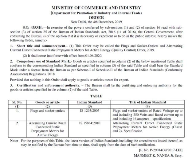BIS released the new gazette notification onmandatory requirements for ISI on PLUG and Socket as per IS 1293 on 4th December, 2019.